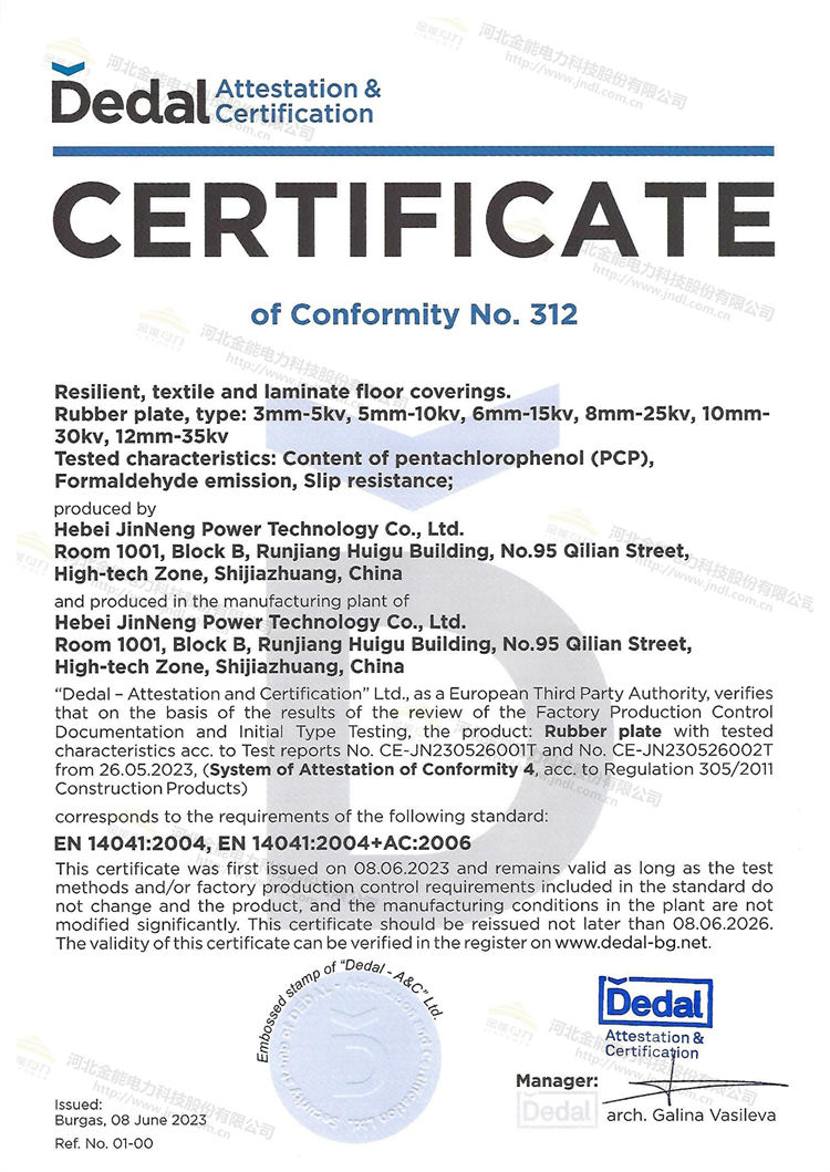 絕緣膠墊是電力安全不可或缺的一部分,其質(zhì)量和性能對于保護人員的安全至關(guān)重要。通過獲得CE認證,并結(jié)合已于先前通過的國際電工協(xié)會IEC耐壓性能檢測報告,說明金能電力絕緣膠墊的產(chǎn)品質(zhì)量、安全性和環(huán)保等級的肯定已經(jīng)得到主管機構(gòu)的認可,產(chǎn)品符合歐盟的相關(guān)標準和法規(guī)要求。