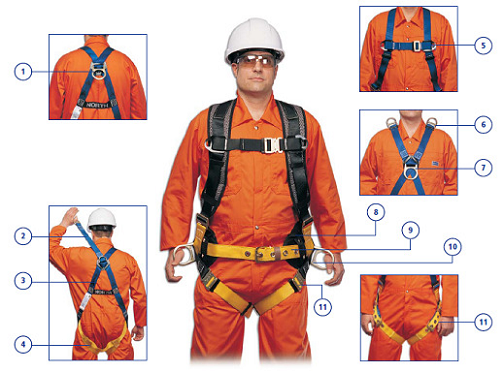 1、墜落防護(hù)連接點(diǎn)。2、D形環(huán)延長(zhǎng)帶。3、向上箭頭指示。4、腿帶。5、胸帶。6、肩部D形環(huán)。7、胸部D形環(huán)。8、腰部支撐。9、腰帶。10、側(cè)面D形環(huán)。11、腿部連接。